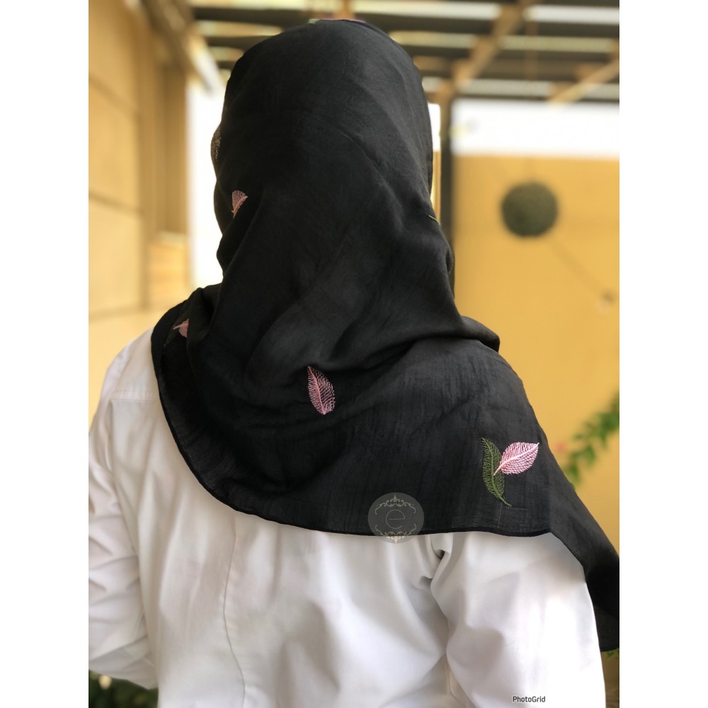 طرحة لنن بتطريز على طول الطرحة لون أسود