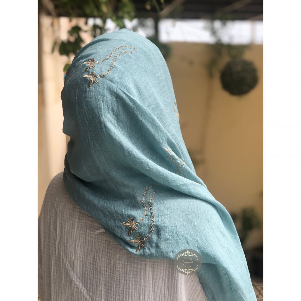 طرحة لنن لون تيفاني بتطريز انيق بطول الطرحة