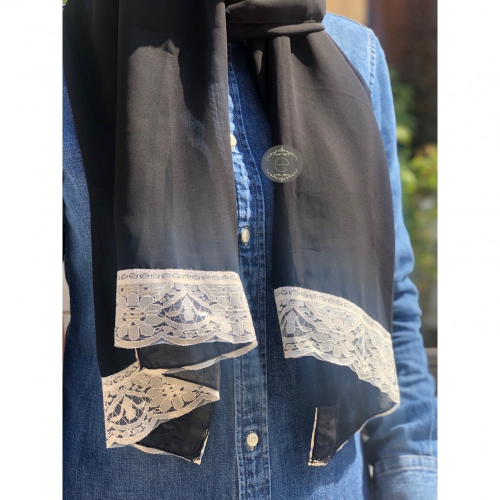 طرحة شيفون لون اسود مع دانتيل ابيض من الطرفين