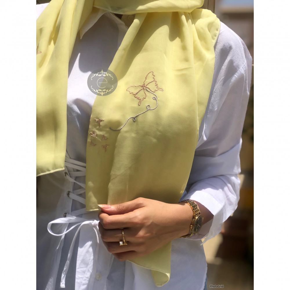 طرحة بوال لون أصفر بتطريز على شكل فراشة