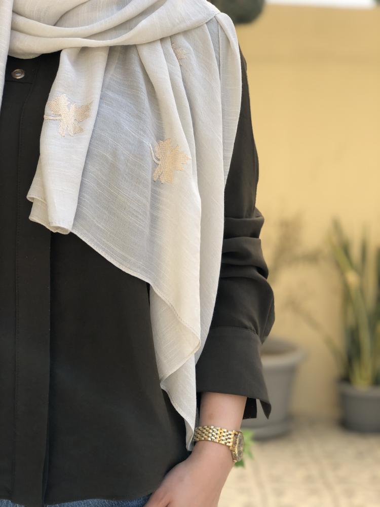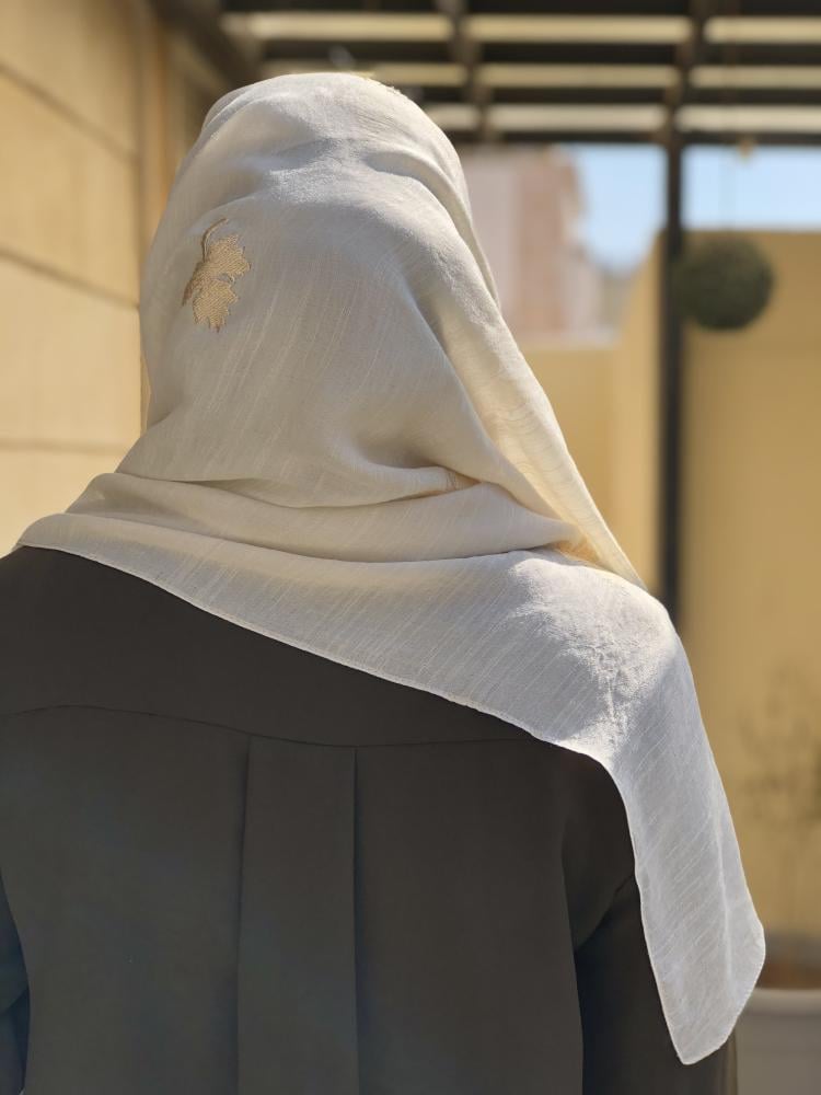 طرحة لنن بتطريز بطول الطرحة لون بيج