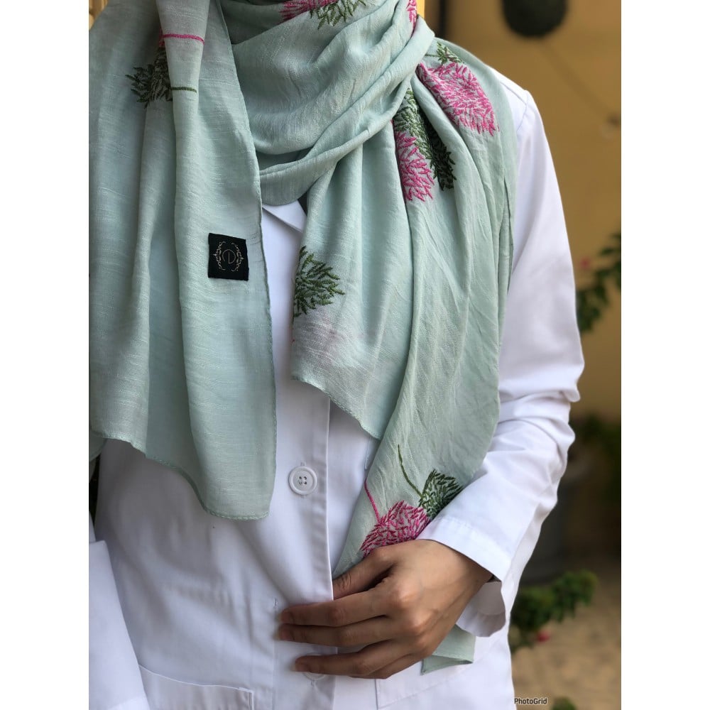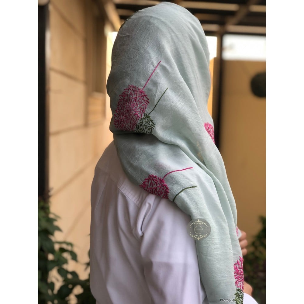 طرحة لنن بتطريز على طول الطرحة لون تيفاني