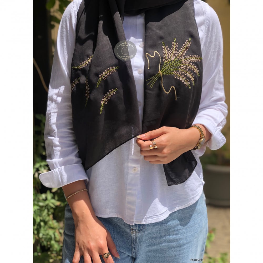 طرحة لنن بتطريز على طول الطرحة لون أسود