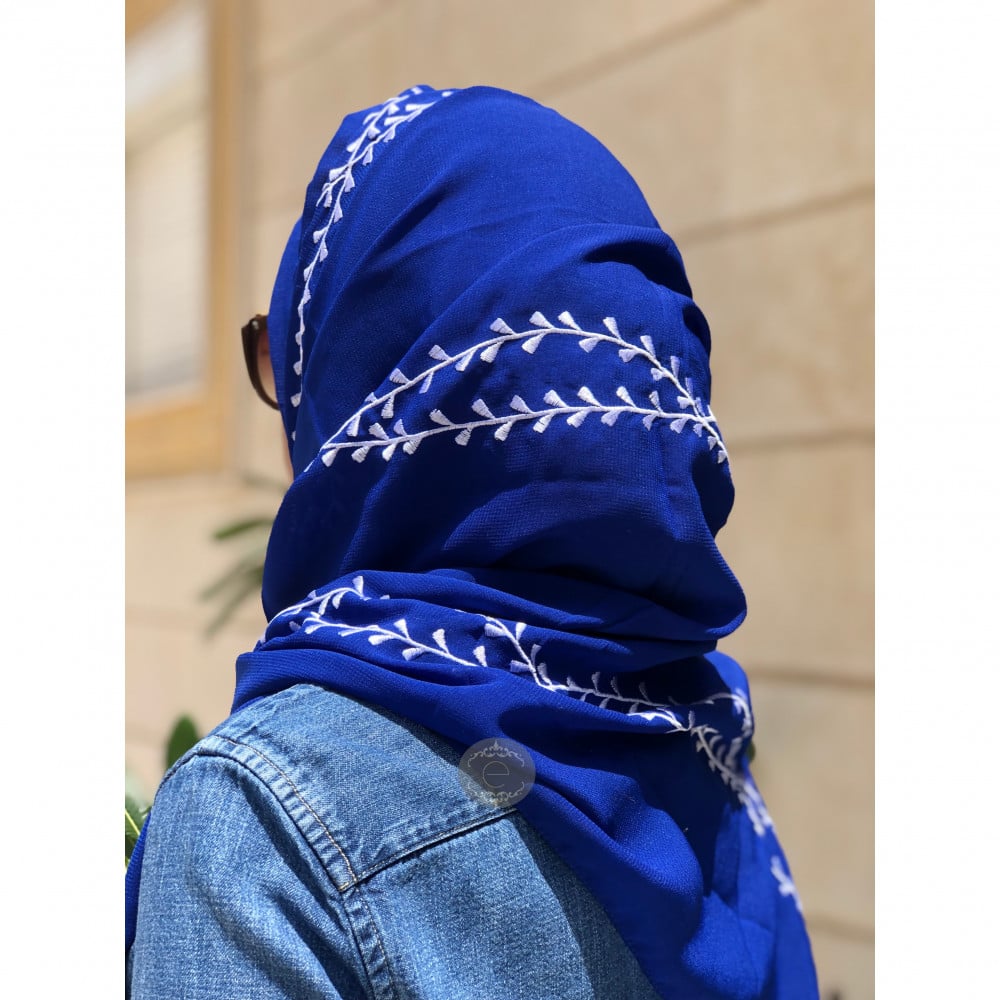 طرحة ليزر لون نيلي بتطريز على طول الطرحة