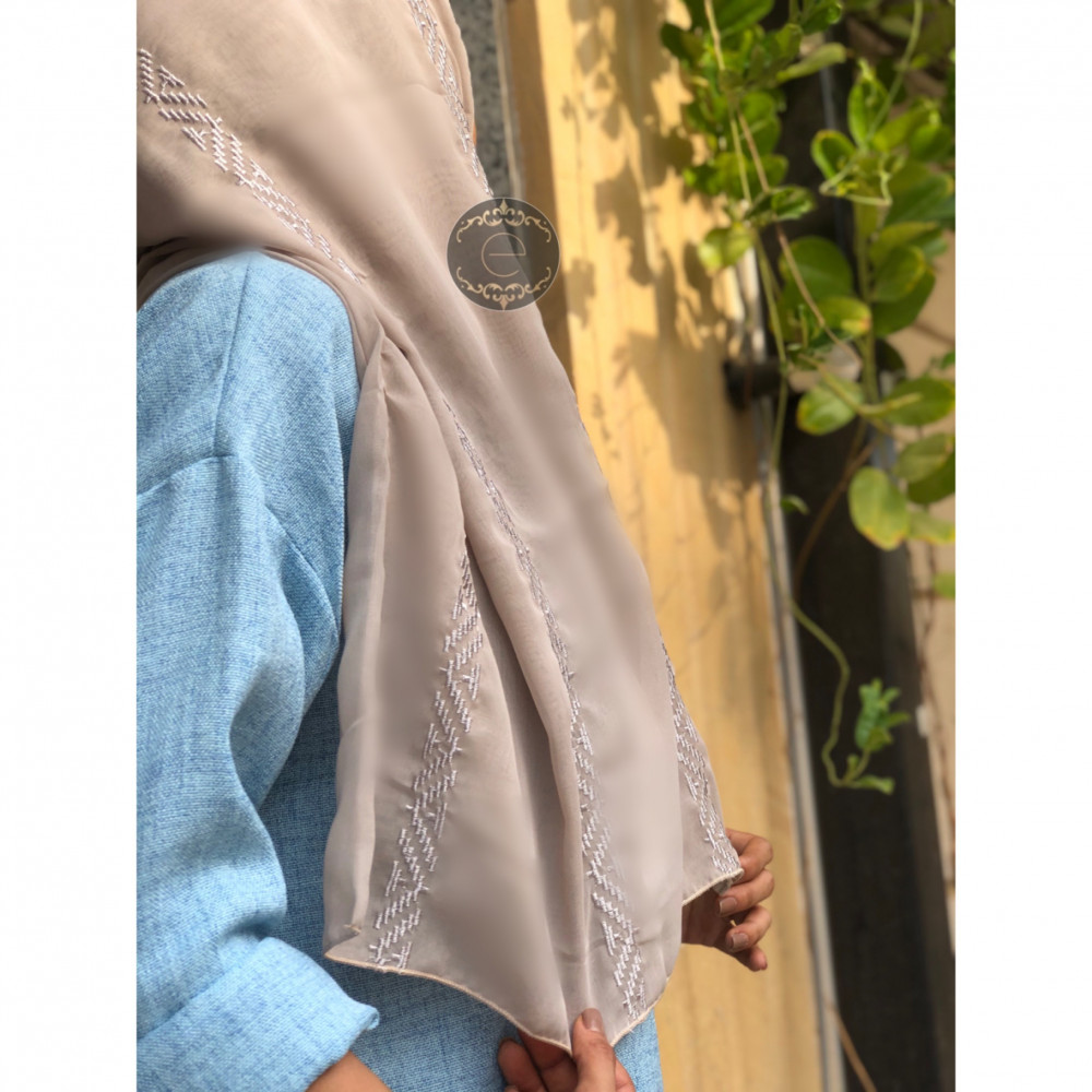 طرحة لنن لون كاكي بتطريز انيق بطول الطرحة